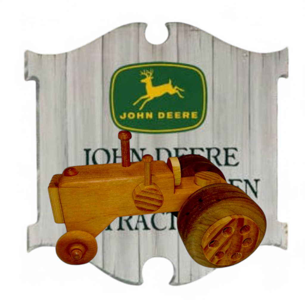 This is a toy tractor designed from a 1940's John Deere Tractor. Unit is 8" Long x 5" wide x 4" Tall. Unit is made from Cherry, Pine, Maple and other Hardwoods. Designed for Girls or Boys of 2 years and up. Unit is also designed to be on your mantel.